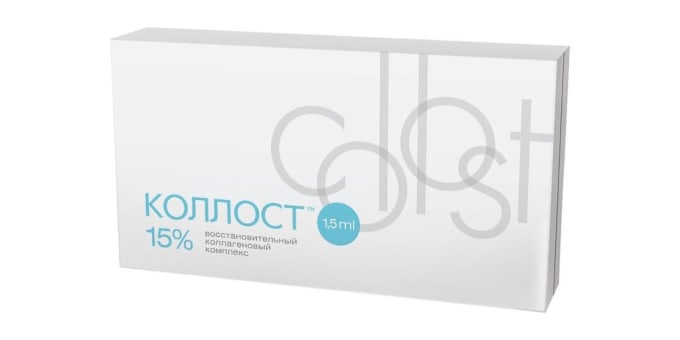 Гель Collost 15% 1,5 мл - коллагеновый имплант, применяющийся для мощной стимуляции репаративных процессов, при введении КОЛЛОСТ продуцируются новые коллагеновые волокна, заполняющие полость в области имплантации, а сам имплантат, постепенно рассасываясь, замещается аутотканью.