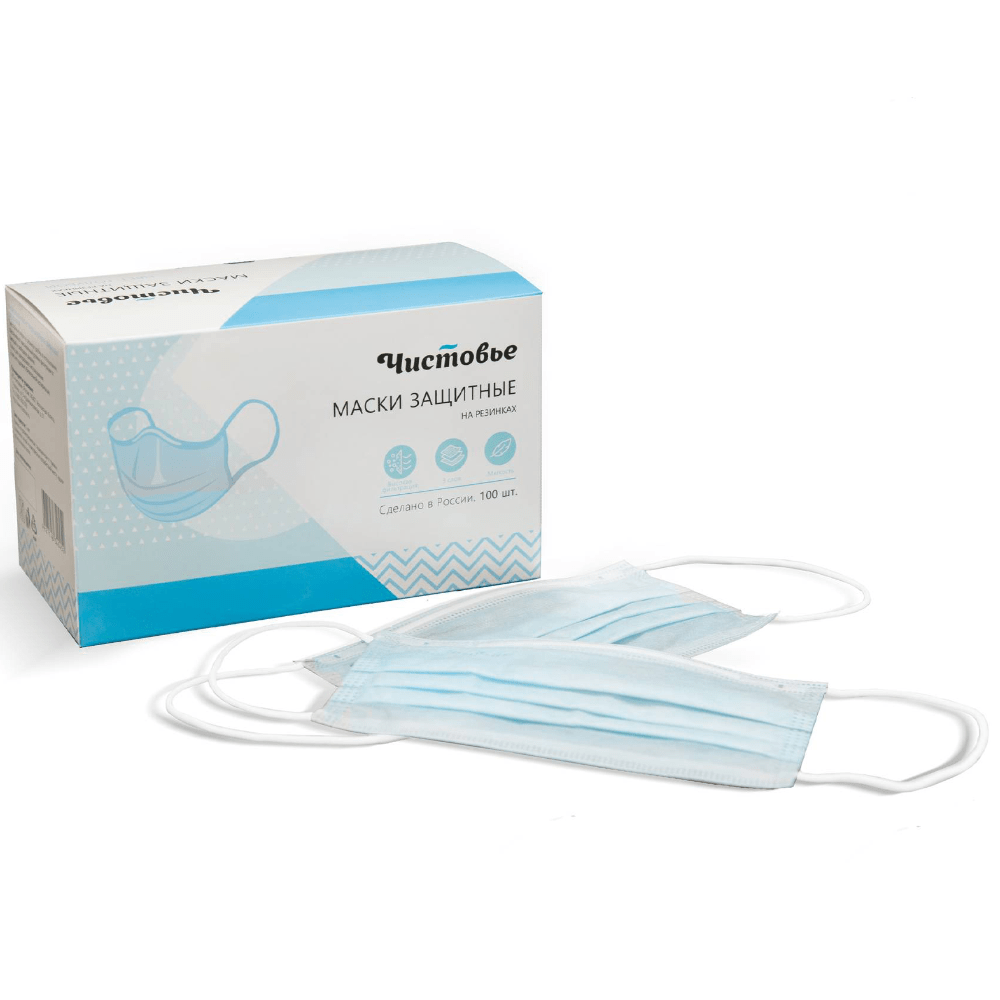 Одноразовая маска на резинке производства компании "Чистовье". Трехслойный материал обеспечивает максимальный уровень фильтрации. Первый и третий слои масок изготовлены из спанбонда, средний (фильтр) из мельтблауна. Маски не препятствуют свободному дыханию. Упакованы в картонную коробку.